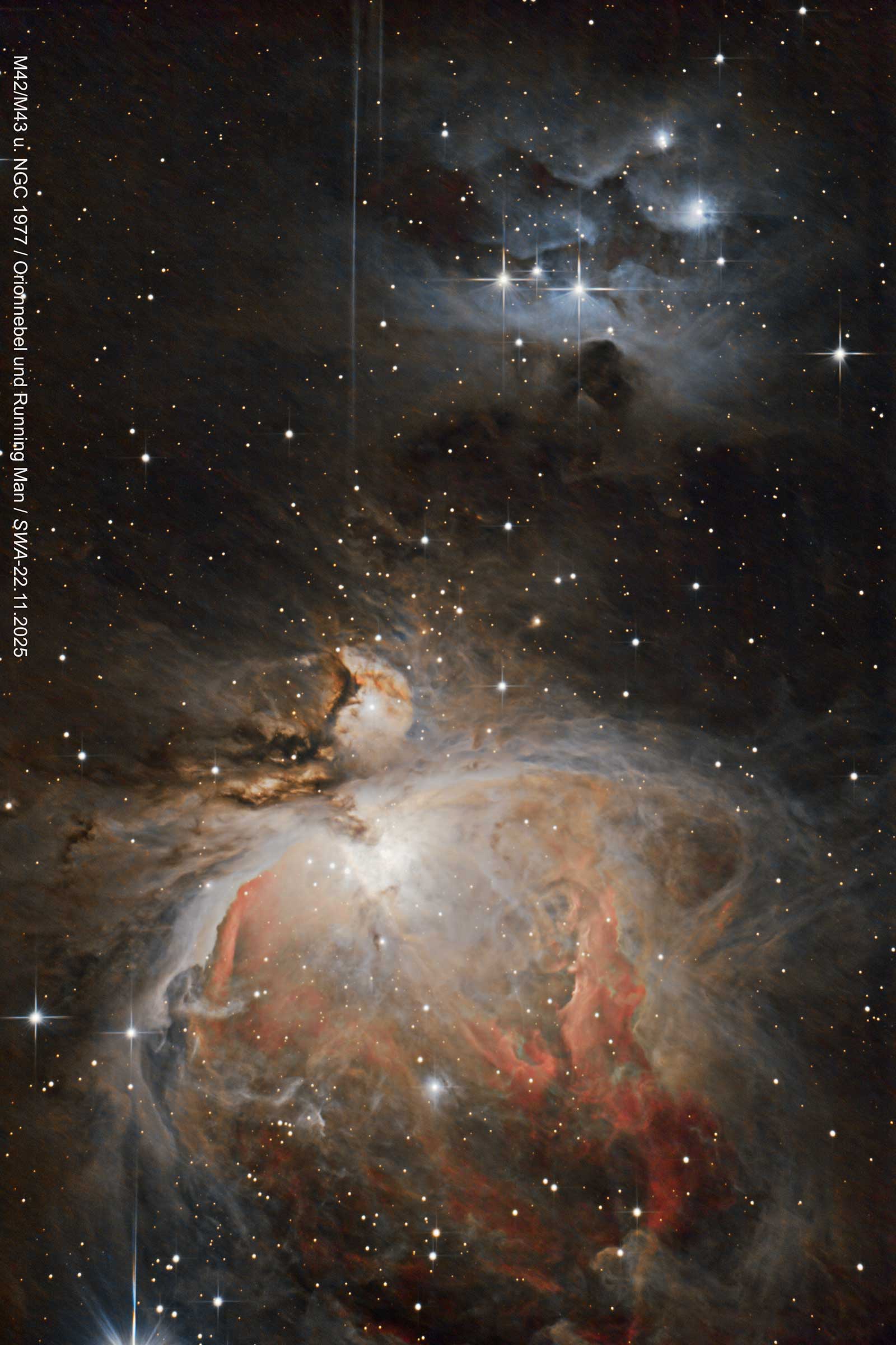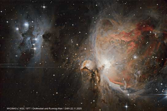 | Jens Seidel - M42 Großer Orionnebel und NGC 1977 Running-Man-Nebel Canon EOS-600d(a), Skywatcher-Newton-200/1000 auf NEQ-5, Autoguiding PHD2 Gesamtbelichtungszeit: 47min ISO-1600 Bearbeitung: Siril, GraXpert, AstroDenoise, Gimp Für größere Ansicht das Bild oben anklicken... Hier Vergrößerung 90 Grad gedreht... |