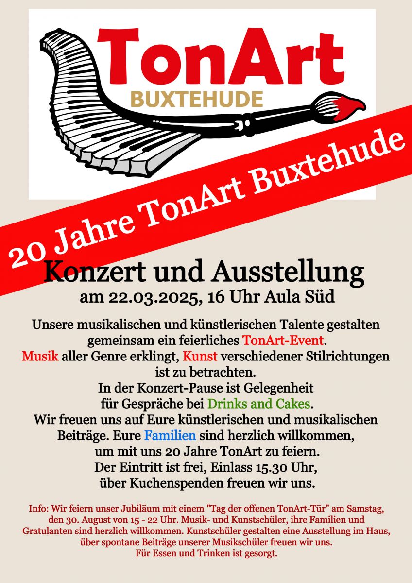 Wir feiern 20 Jahre TonArt | Konzert und Ausstellung am Samstag, dem 22. März 2025, 16 Uhr in der Aula Süd